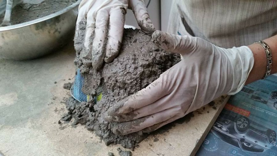 Primero, se prepara la mezcla de cemento para ponerlo en un molde plástico redondo para la parte de arriba de los hongos más pequeños. El espacio es para que pueda entrar en el tronco que armo después.
