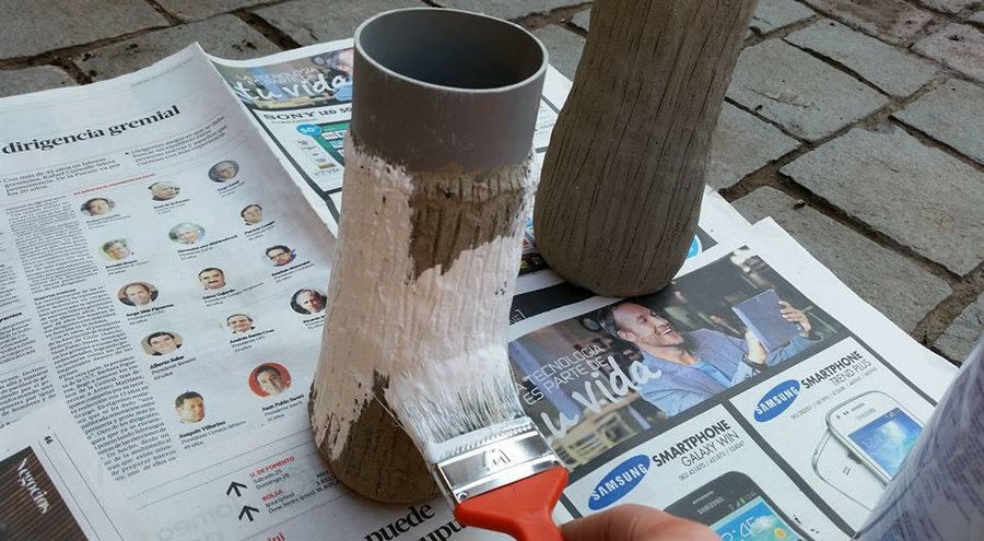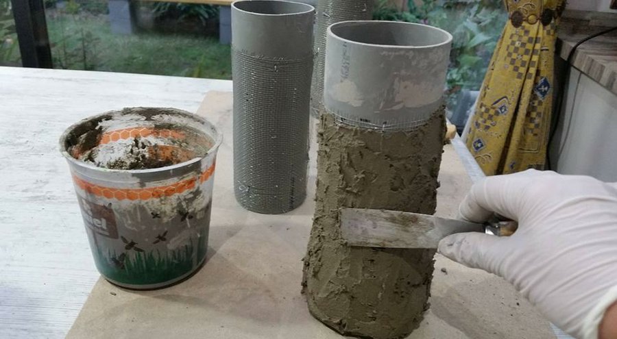 Para los troncos utilicé tubos de pvc, forrados en malla de alambre para que se agarre el cemento.... hasta darle esa forma especial de los hongos... (había visto hongos con tubos rectos... pero quería que los míos fueran lo más natural posible)