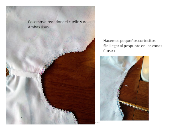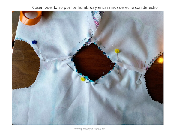 Preparamos el forro igual cosidos por los hombros y encaramos ambos derechos, sujetamos con ayuda de alfileres y cosemos pespunte: