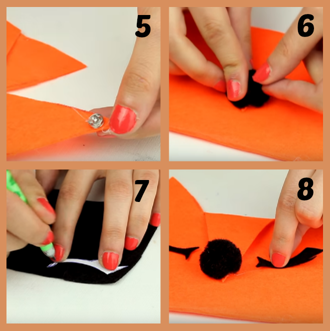 6. Ahora empezamos a decorar la cara del zorro y ponemos un pompón en el extremo que además de ser el cierre, es el hocico.