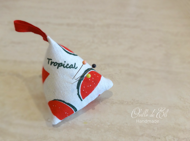 No cabe duda que la moda llega a todos los rincones y mi espacio de costura no podía ser la excepción, esta temporada veraniega la estaré decorando con sandias ya que es un tema que me gusta además de ser fresco e ideal para esta estación Para la elaboración de este alfiletero he cortado dos cuadros de 10 cm por lado, los he enfrentado y cosido en U, es decir cosí por tres de los lados dejando 1 a ...