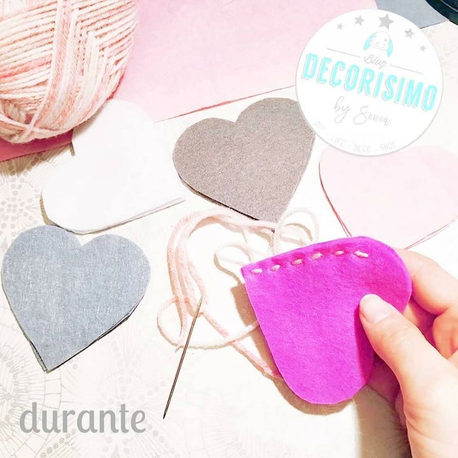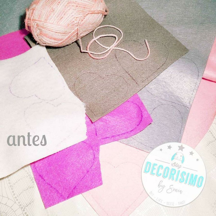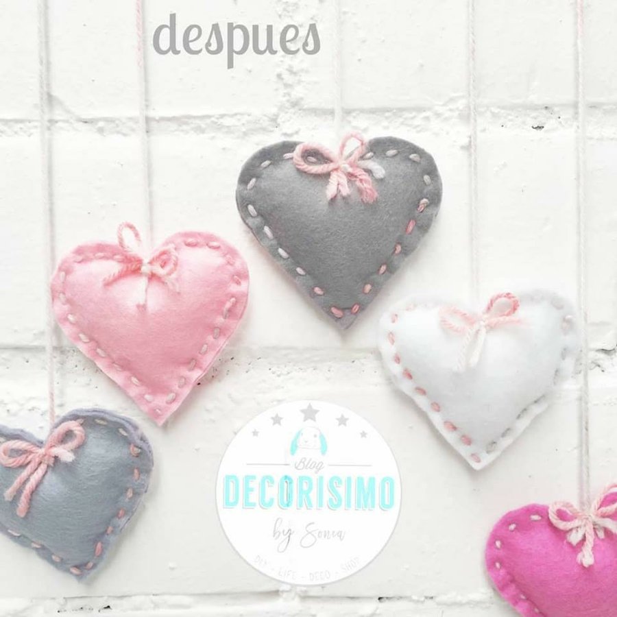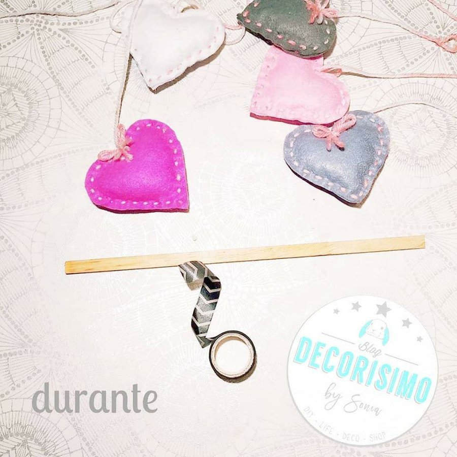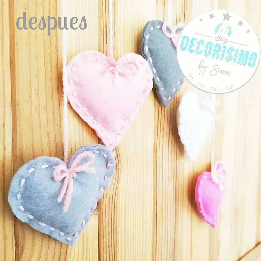 Cortamos de cada color 2 corazones, los cosemos con el cordel para que se vea la puntada y los rellenamos con espuma de #cojines. Les ponemos un trocito de cordel a distintos niveles y lo colgamos de la maderita o varita elegida y ya lo tenemos, listo para nuestro recibidor ,salón, habitación del peque de la casa .