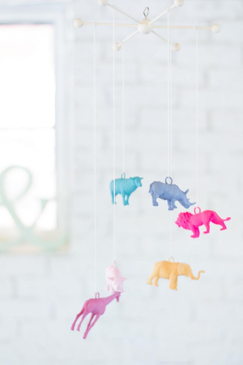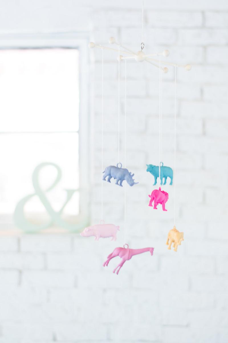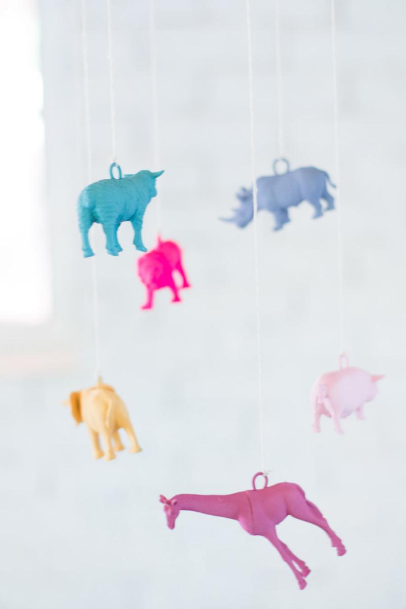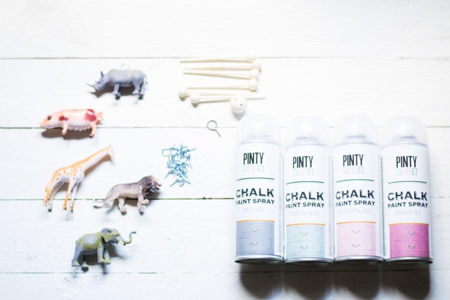 Materiales: Juguetes de plástico, del tipo que sean, en mi caso animales. Pintura a la tiza, alcayatas, cuerda y palos de madera que también encontramos en los bazares. En este caso utilicé un mecanismo que me regalaron una vez que precisamente es para realizar móviles para cunas y camitas.