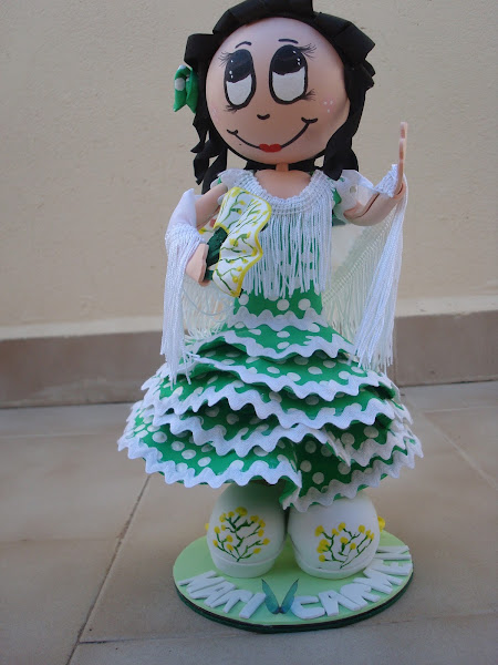 Esta fofucha flamenca fué un encargo de una apasionada de la Feria de Abril a la que le hacía mucha ilusión tener su fofucha sevillana. Es un poco más grande de lo normal porque la quería con muchos volantes.Está hecha 100% de goma eva exceptuando las perlas de los pendientes y el collar. Incluso los lunares del vestido son pequeños trozos de goma eva pegados y el mantón y el abanico son pintados ...