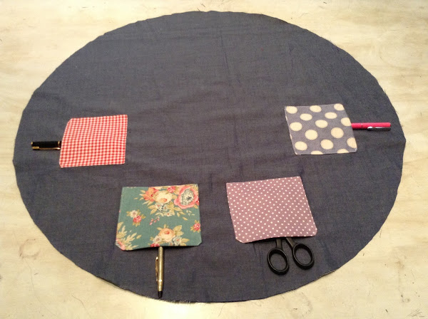 Ahora fíjate bien es este paso...es importante. Coge el circulo de tela y le colocas la tapa en el centro. Después coloca encima los 4 bolsillos, dejando unos 4cms. de separación entre ellos y todos a unos 4 cms. de distancia de la tapa, así (foto)