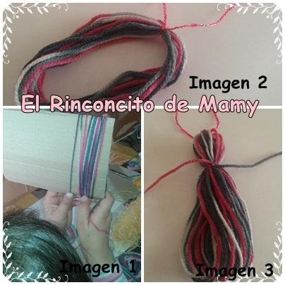 3. Para los brazos volvemos a enrollar la lana en el cartón grande, esta vez unas pocas menos vueltas. Lo sacamos del cartón y atamos dos nudos en los extremos, que serán las manos. Imagen 4.