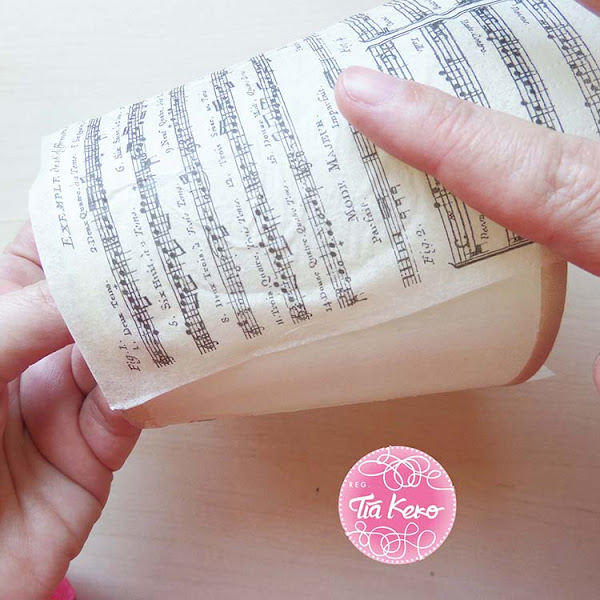 Después ponemos la capa de la servilleta decorada, acordaros que generalmente vienen tres capas de papel, debemos desechar las dos capas blancas, las que no están decoradas y nos quedamos con la que está decorada.