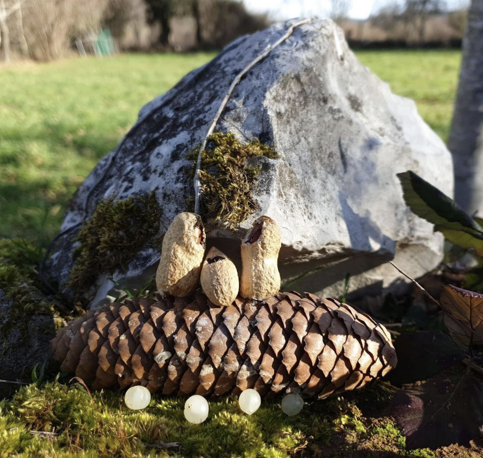 Para poder dejarlos en el monte, nuestros Nacimiento tenían que ser ecológicos, no queríamos contaminar. Realizamos un Nacimiento de cacahuetes. Nos lo pasamos genial haciéndolos en familia. Hicimos tres y los colocamos en distintos lugares.