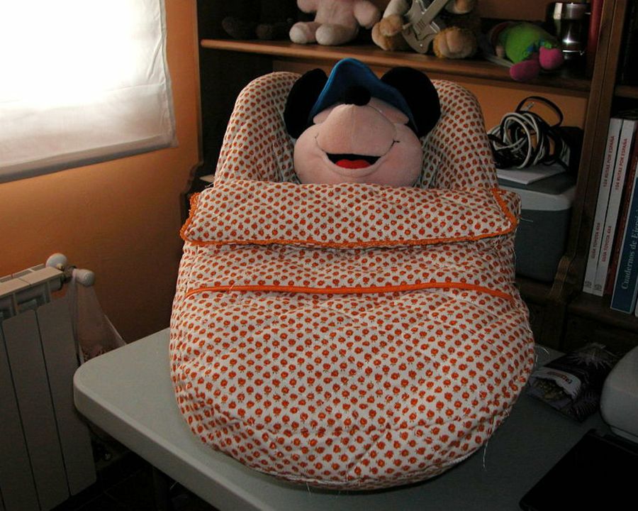 CaT-WoMaN realizó una funda para abrigar la cuna del bebé en el coche, labor que completó con una mantita. En la imagen vemos el conjunto terminado, con el regocijante muñeco que le sirvió para tomar las medidas, a fin de evitar cualquier riesgo de pinchazo con un alfiler a la pequeña viajera.