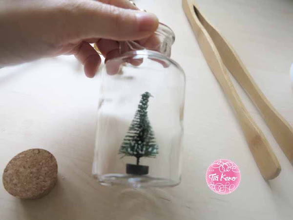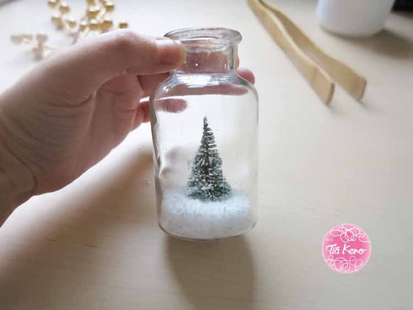 Ahora vamos a poner un poco de nieve, conseguimos la nieve en cualquier tienda de chinos, son de esas bolsas de nieve que se usan para los belenes. Pues simplemente dejamos caer dentro del bote un poco de nieve hasta que cubra del todo la base del bote de cristal y tape completamente el pie del arbolito.