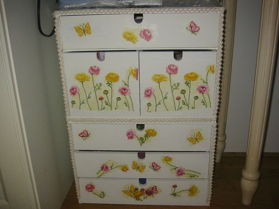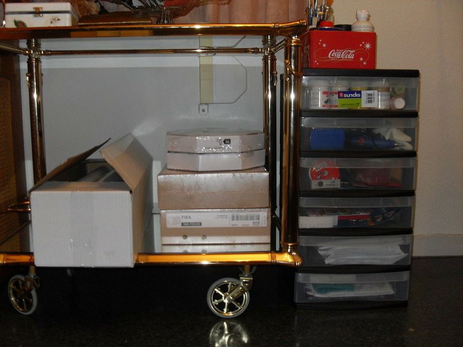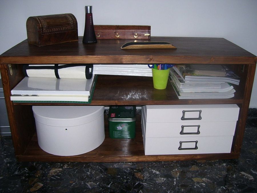Kayra ha iniciado en el foro un interesante post sobre el orden. Nuestra lectora reúne en su casa una cantidad considerable de material, entre costura, punto de cruz, pinturas y scrap. “Lo guardaba todo en un rincón de un armario, pero con el tiempo se me quedó pequeño y ahora lo tengo todo en pequeños rinconcitos por toda la casa”. Para solucionarlo, fabricó ella misma un pequeño mueble de madera y varias cajas de cartón piedra. “Por ahora sólo tienen una pintura de base, a lo mejor luego les hago algo más. Lo de al lado es una sombrerera, comprada en los chinos y pintada como las cajas”.
