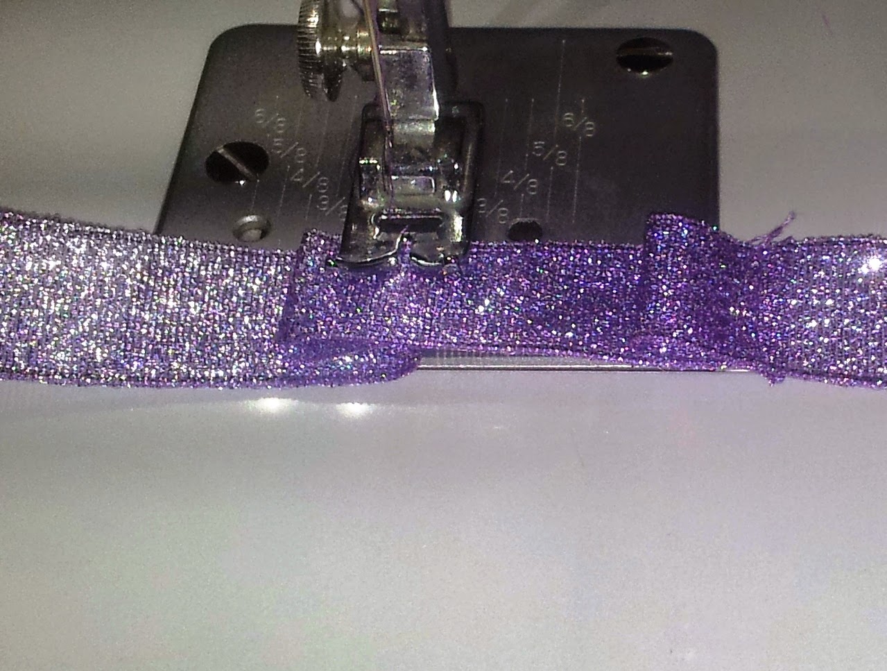 Recortamos la tela dos centímetros más grande que el cartón, la dejamos aparte.Con la cinta de bies vamos haciendo pequeñas formas en las que nos pueda caber la diadema, y cosemos, tal como se muestra en la imagen.Lo haremos el largo que nos mida el cartón.