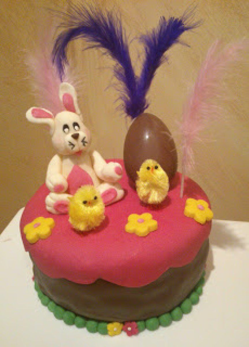 La usuaria Vanebcn nos muestra esta suculenta mona de Pascua, realizada con fondant. Es tradición en Cataluña regalar este postre a los ahijados, como símbolo de nuestro afecto. Sobre su superficie podemos ver un conejito y un huevo de chocolate, al igual que algunos detalles como pequeños pollitos.