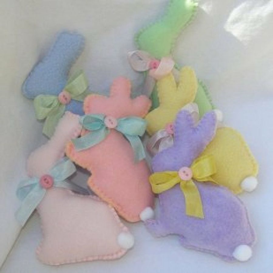 La amiga Luzdago ha cosido estos bellos conejitos con punto festón para ocultar las puntadas y las costuras. Los ha elaborado en diferentes tonalidades, colocándoles un lazo sujeto por un botón en el cuello. También les ha hecho un gracioso pompón a modo de cola, con hilo blanco o algodón.