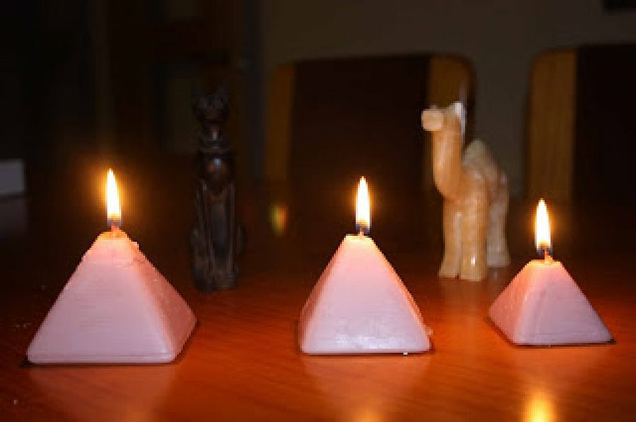 La amiga Isabel86 ha hecho estas velas con forma de pirámides a partir de recuerdos que trajo de Egipto. Primero, necesitamos un molde, el cual sacamos con algo de escayola y agua sobre un tarro de plástico. Debemos untar bien el recipiente con aceite para poder extraerlo con mayor facilidad, sin romperse.