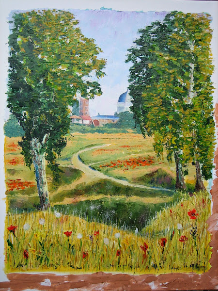 La palabra que me sale para describir este cuadro es Rotundo, es un cuadro que cuando se ve de cerca, como que te hace chiquito, aunque su tamaño (81x65) no es muy grande. ¿ Quizás sea porque esta pintado con espátula ?. En cierta forma me recuerda, inconscientemente a algunas obras de Cezanne.....Finalmente y para darle un caracter aun más naturalista, le di algunas capas de arcilla y pegue en el ...