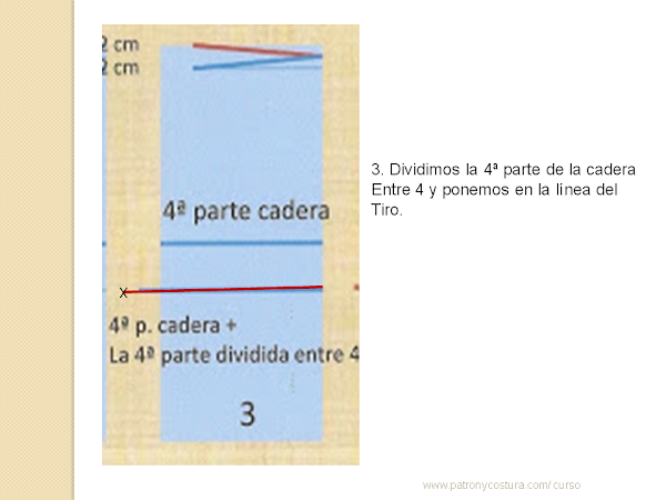 Pues aquí tenemos que añadir a la parte de delante la cuarta parte de tu 1/4 parte de cadera y lo que te de es la cantidad que tienes que añadir. y para la parte de detrás añadimos 2 cm más.