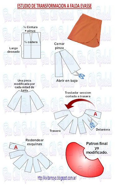 COMO TRANSFORMAR EL PATRON BASE DE FALDA EN UNA EVASSEPara trazar esta falda evasse sin pinzas y con la particularidad de tener una sola costura al frente, debemos modificar el patron base de FALDA RECTA. Cerramos las pinzas de entalle de la cintura y abrimos la linea que se continua hacia el dobladillo del patron. Vemos que se abrira en el bajo, haciendo un vuelo evasse. Hasta aqui la falda tiene ...