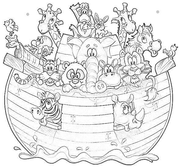 Y Noé construyó una gran embarcación de madera. Una vez terminada el arca, Noé metió en ella una pareja de cada especie animal y luego entró con toda su familia: su esposa, sus tres hijos, llamados Sem, Cam y Jafet, y las tres esposas de sus hijos.