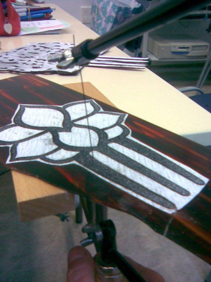 Una vez pegado, empezamos a recortarlo por el exterior con la segueta o arco de sierra. El movimiento de ésta será oscilante, de arriba a abajo y en un ángulo de 90º. Después, empezamos a realizar los brocados con una broca fina.