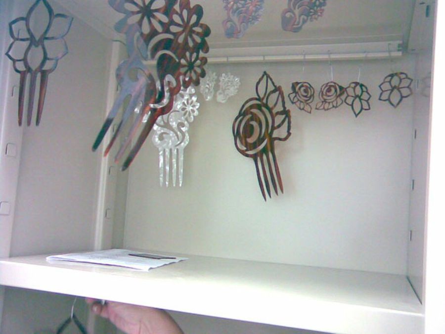 Al finalizar, introducimos la peineta en agua caliente para eliminar el papel y los restos de pegamento. Cuando esté bien seca, repasamos con una lima todos los bordes.Cuando lo hayamos elegido, lo pegamos bien al acetato o material sintético con el pegamento de barra para que sea fácil de eliminar.