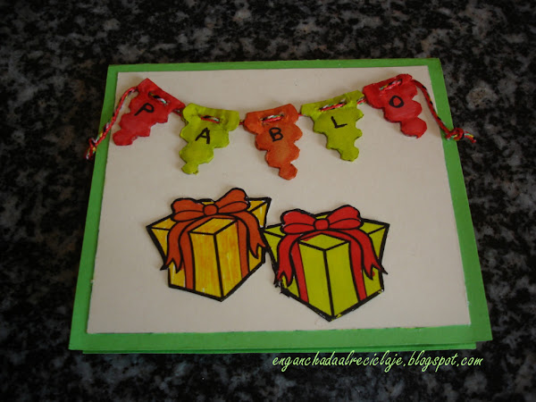 Hola hoy voy a publicar varias entradas de varios trabajos que he hecho estos años. Para empezar, os dejo una tarjeta más de felicitación, que como todo, es con ayuda delos niños....Y así es como nos quedó la tarjeta.....Cómo ven es muy sencilla.