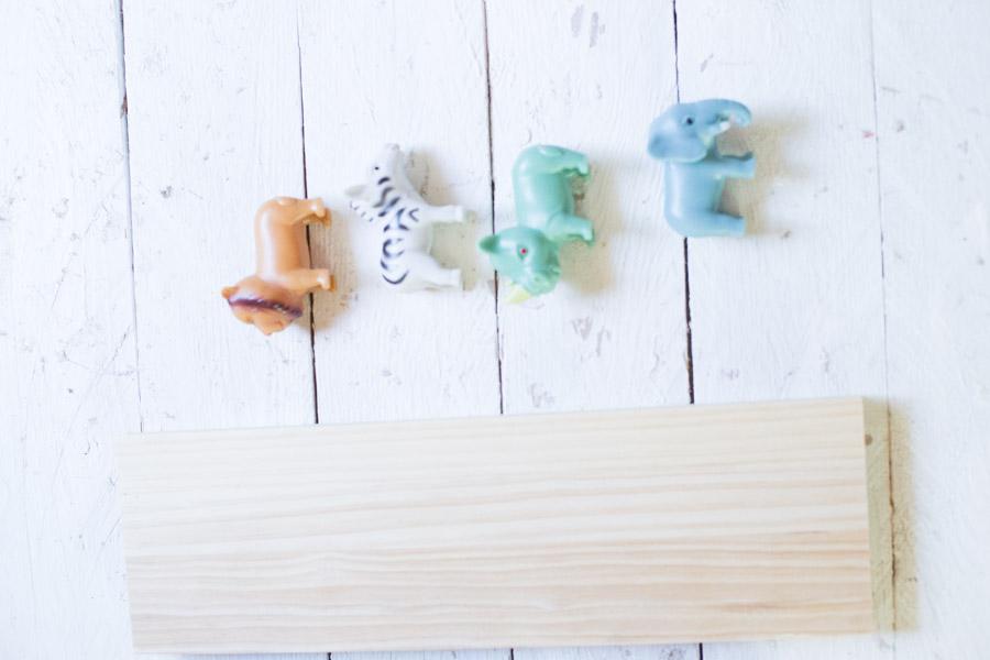 Materiales: Tabla de madera, juguetes plástico, sierra, lija, cola, brocha y pintura Chalk Paint.