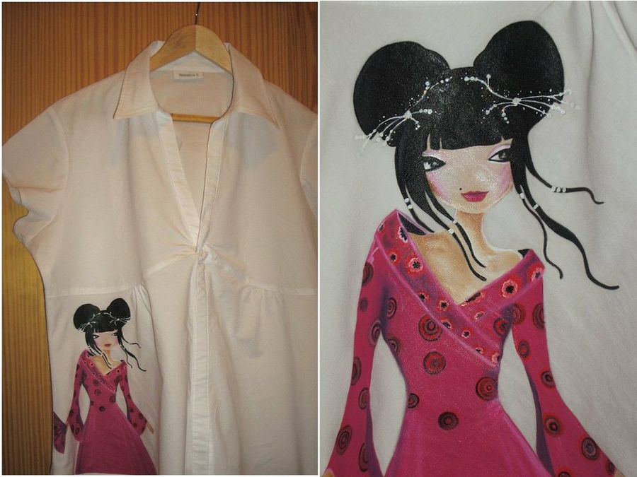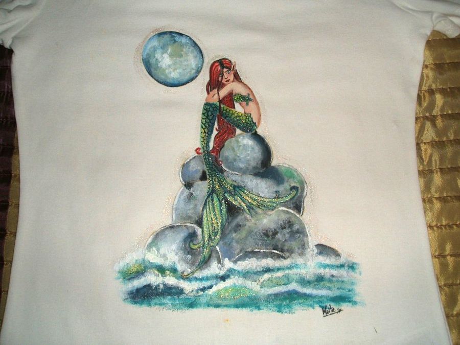 La habilidad consumada y el buen gusto quedan bien patentes en dos piezas muy distintas. La famosa Anarkitty recibe un tratamiento monocolor, delicado y onírico, mientras que el legendario guerrero ostenta colores primarios muy llamativos, que realzan su desafiante presencia.Fayry es otra de las foreras que sienten por la pintura en tela una atracción apasionada, y plenamente correspondida. Este verano ha decorado una camiseta con una sirena de rasgos élficos, criatura muy típica de su mundo fantástico. ¡Desde luego envidiamos a las sobrinas de nuestras artistas! También en este caso una sobrina de la autora ha sido la destinataria feliz del bello regalo.