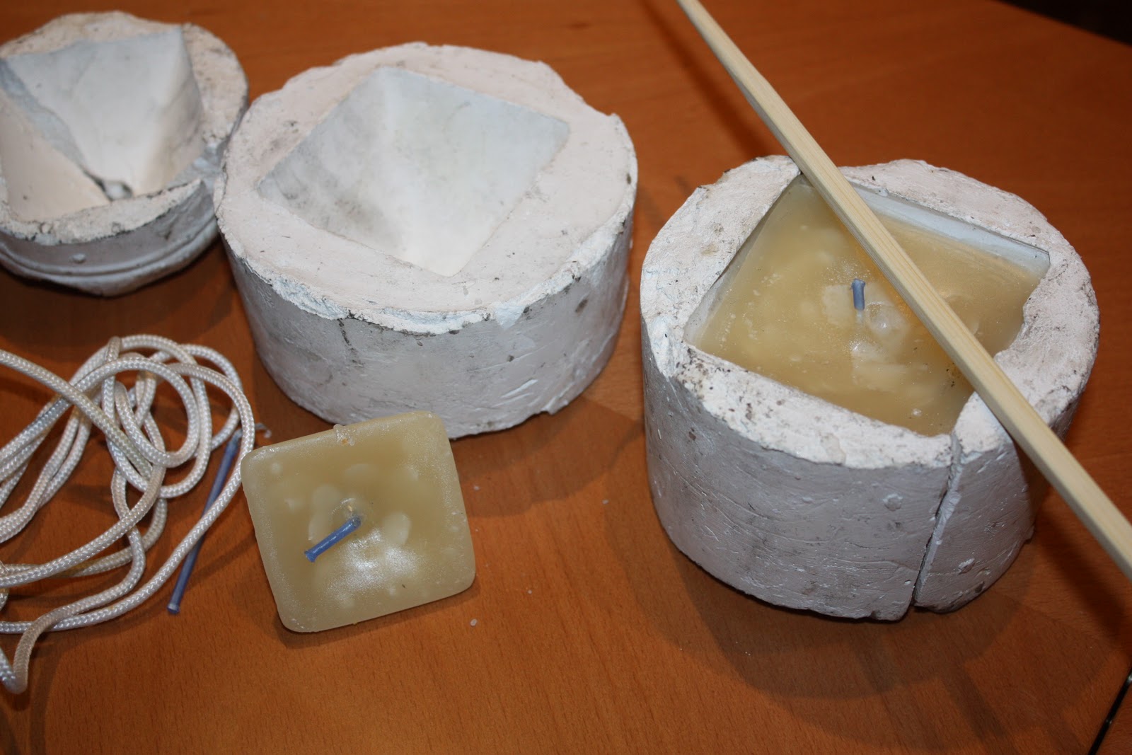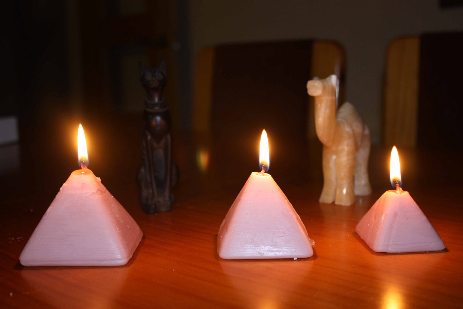 Tenía las pirámides (hechas de alabastro que compré en el Valle de los Reyes, Luxor), así pues hice un molde de las pirámides. ¿cómo? Puse un tarro (mejor de plástico por si tenemos que romperlo) de dimensiones similares a las pirámides, agregué escayola y un poco de agua. A continuación clavé las pirámides, embadurnadas previamente con aceite de girasol por ejemplo, en el fondo del tarro junto con la escayola (primero la punta, quedando la base arriba). Esperamos un rato hasta que vemos que se ha secado la escayola. Con cuidado sacamos la pirámide y ya tenemos un molde para hacer velas.