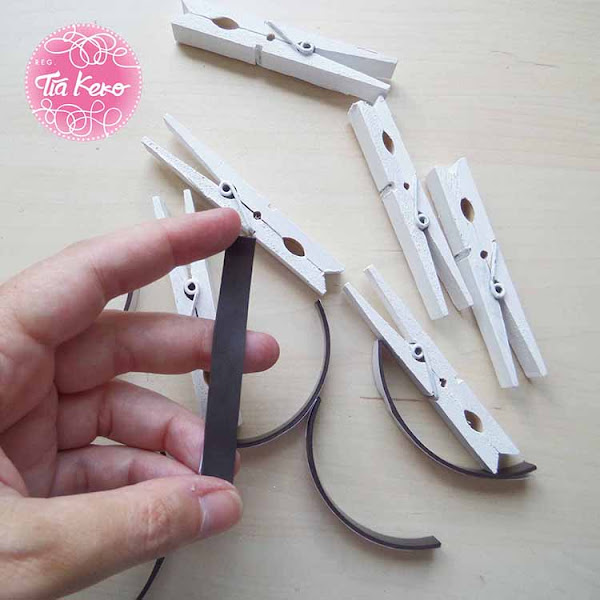 Cuando las pinzas ya están secas comenzamos a pegar el imán en rollo que tenemos, uno a uno, en cada pinza. Para ello recortaremos tiras de imán de la longitud de la pinza y la pegaremos en la parte de atrás de la misma.