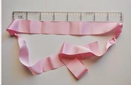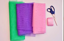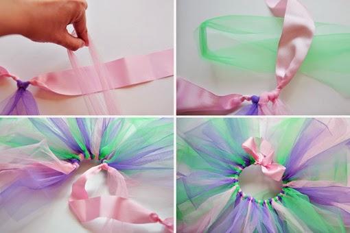 Ahora, vamos a ir atando las tiras de tul a la cinta de razo, intercalando colores.