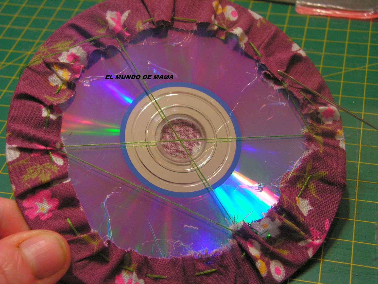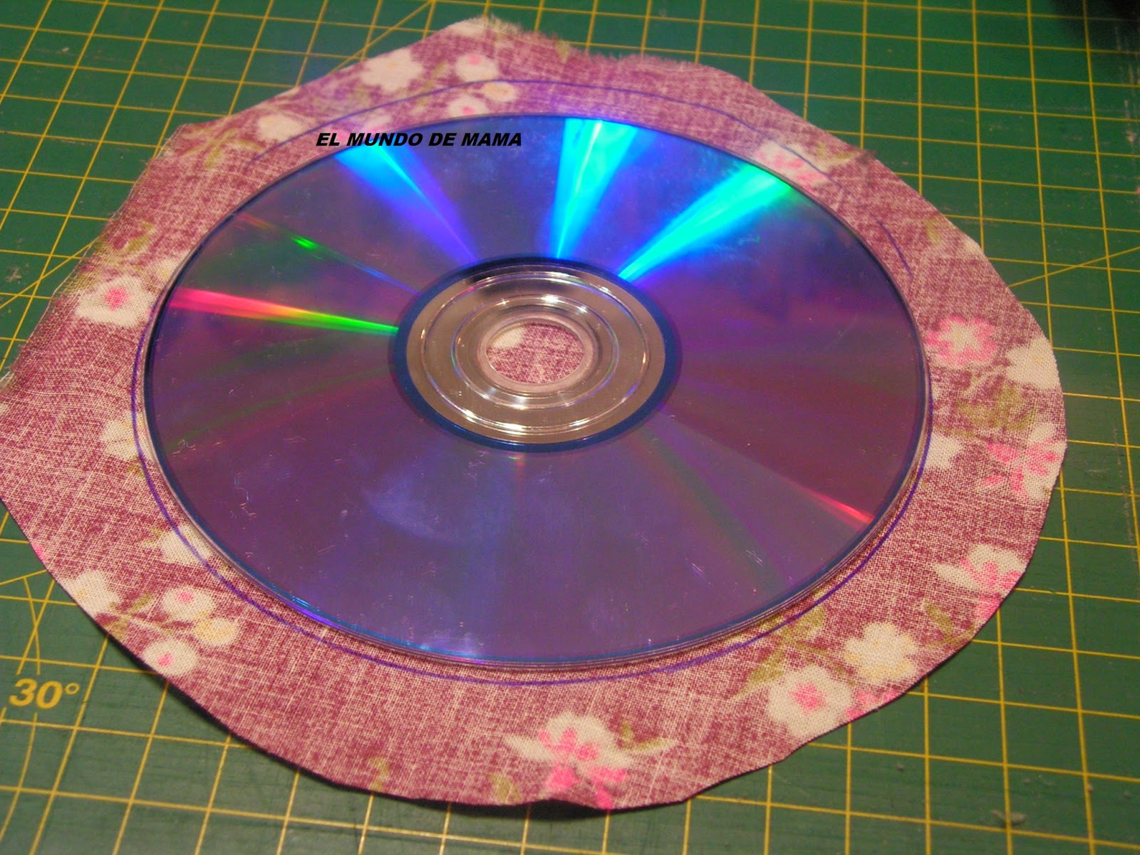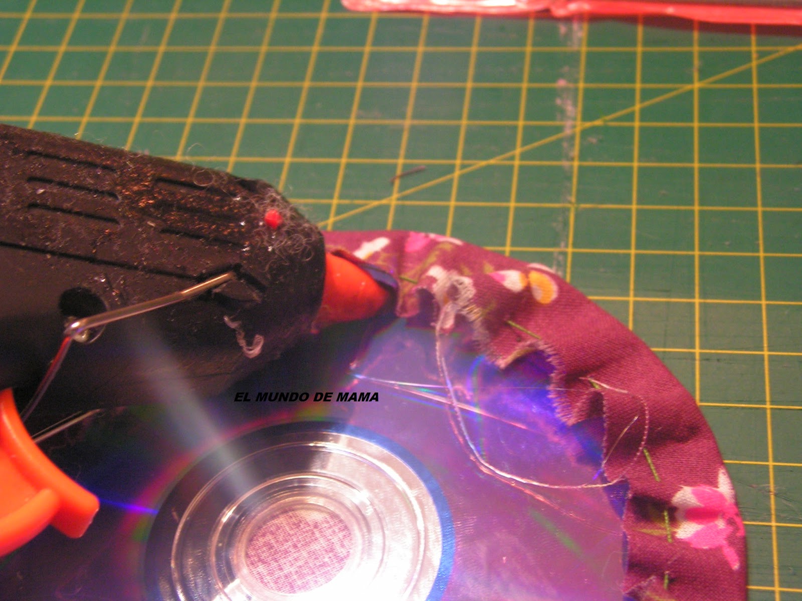 Cortamos el circulo de tela interiorcon 0,5cm mas grande que el cd