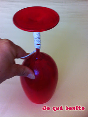 He dado vueltas co la cuerda hasta donde me ha parecido. Iba poniendo de vez en cuando alguna gotita de pegamento (ahora uso silicona liquida y me gusta más) para que se pegue la cuerda a la copa y no se mueva.
