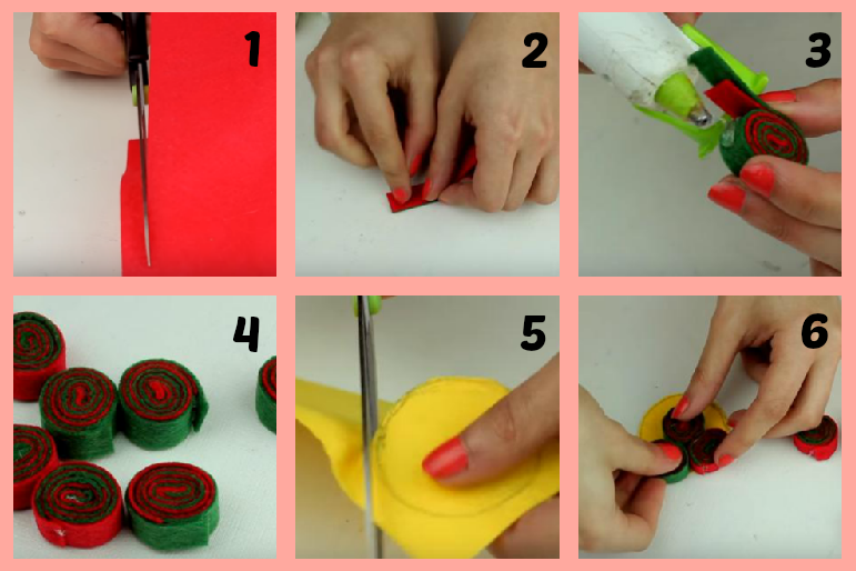 1. En primer lugar recortamos tiras de los fieltros que hemos seleccionado, en este caso el rojo y el verde.