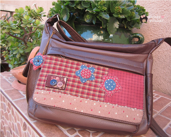 Los bolsos con aplicaciones patchwork me encantan, si no son de tela, siempre les hago alguna decoración o tuneo a mi gusto. Lo ideal es que sean bastante sencillos con una tapa lisa para poder hacer las aplicaciones.Este es el que llevo ahora. en invierno prefiero los de bandolera.Os dejo todos los detallitos, por si os apetece la idea, He utilizado 6 telas diferentes combinadas en granate, az ...