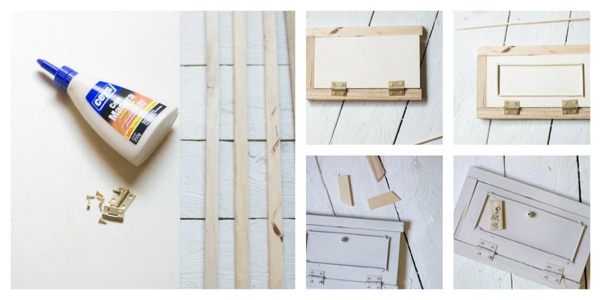 Con dos listones de madera pequeños, realizamos el marco de la puerta. Con la chapa de madera y las bisagras, que se encuentran en todos los bazares, las unimos al marco.