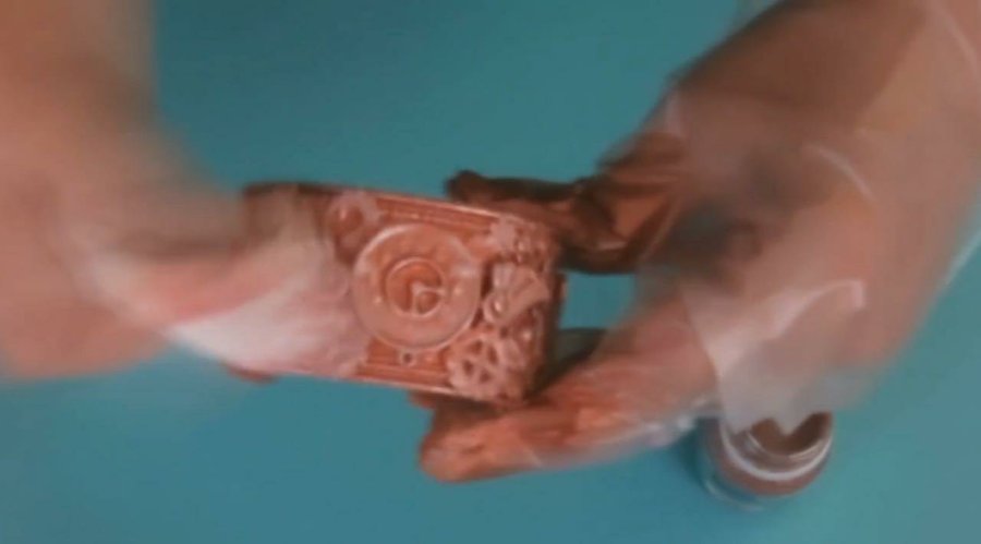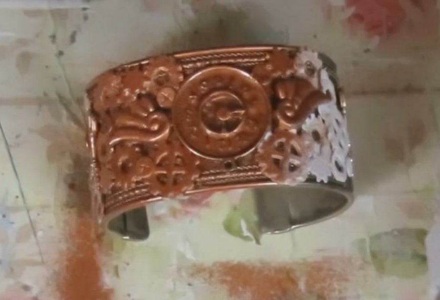También aplicaremos la pintura rosa metalizada con un trapito húmedo en las partes que queremos resaltar los dijes y engranajes, debe ser solo en algunas partes, sin tapar por completo el color ocre de la pulsera.