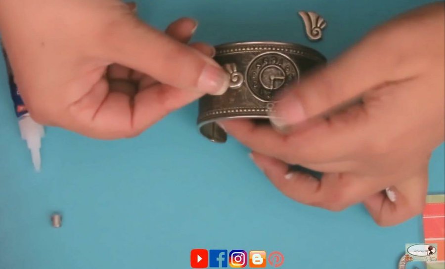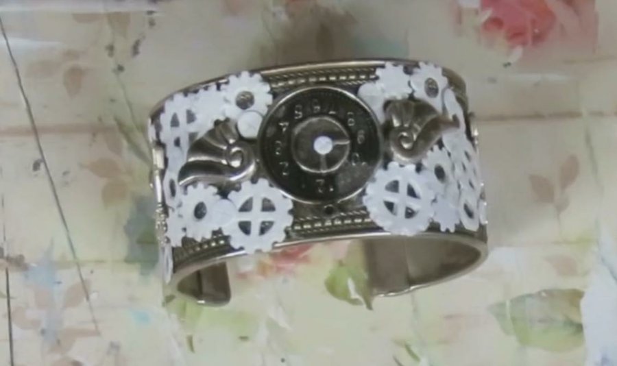 Lo primero que haremos es limpiar muy bien la pulsera, escogeremos un dije central, y pondremos algunos mas por los lados, teniendo en cuenta que el steampunk usa mucho relojes, engranajes etc, los pegaremos con cola caliente, teniendo cuidado de no quemarse si los dijes son metálicos, como se muestra en el vídeo al final de pos.