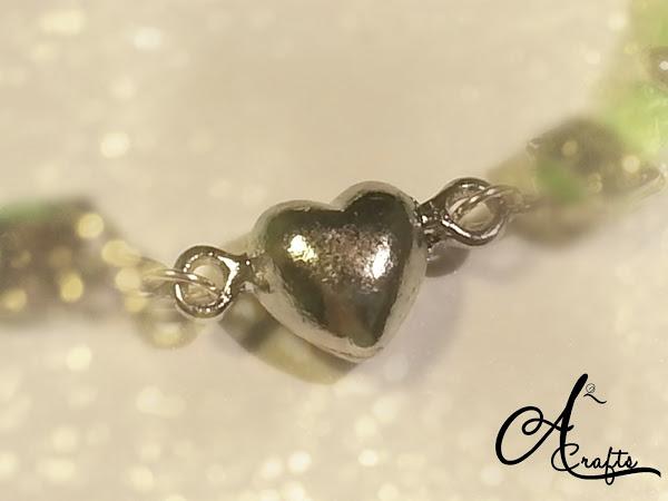Lo adornamos con un abalorio de color verde y unas cuentas de plata que le hacen juego. El toque final lo pone el cierre. Esta vez, he usado un nuevo cierre, que es de imán con forma de corazón.