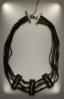 Pulsera con abalorios hechos de arcilla dorada y marrón. Además lleva como adornos perlas y entrepiezas de zamak. El cierre es un original mosquetón gigante de zamak.