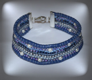 También podemos hacer brazaletes con varios cordones de cuero hasta obtener la anchura deseada. Yo emplee cuero de diferentes grosores y perlas. Este es el resultado:
