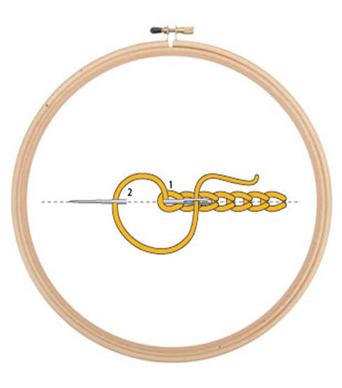 Saca la aguja en 1 e insértala en el mismo sitio dando la vuela al hilo por debajo de la aguja, formando una especie de bucle.