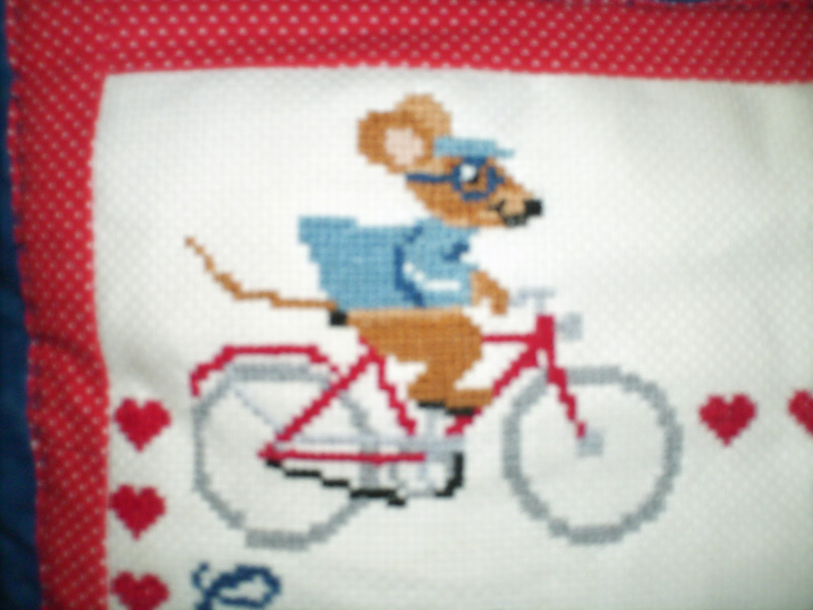 tal vez muchas persona piensen que para aprender esto se necesita llevar cursos ydéjenmedecirles que para nada, yo nunca he llevado cursos de esto solo con las ganas que tenia de hacer algo diferente y manual entre a una tienda donde venden revistas me gusto mucho la revista de punto cruz, me fui a mi casa y la vi toda, luego entre a una tienda donde venden hilos y pregunte por hilos para punto cruz, y en ese momento me di cuenta que se compraba pornumeración, entonces saque mi revista y compre todos los hilos necesarios y un poco de tela y empece , obviamente con algunos detalleslógicos, tome medidas, hice primero los ratones, luegoescribíla letra y por ultimo hice el borde, por aquello que algo fallara no echarme el borde.