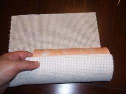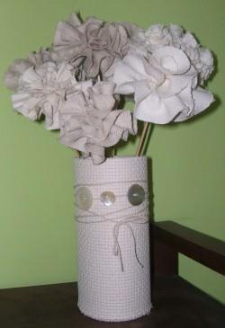 Para hacer el jarrón he utilizado un bote de cartón que tenía por casa. Lo he forrado con tela y le he dado unas puntadas para que se sujetara. La tela sobrante de la parte superior la he doblado hacia dentro del tubo.