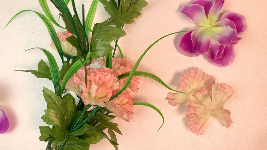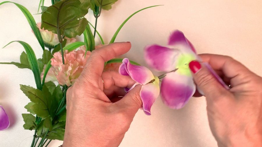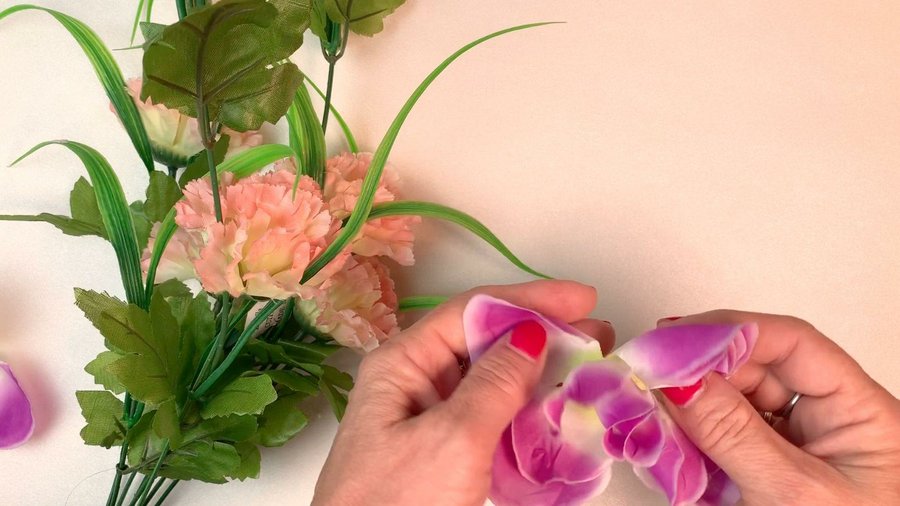 Las flores vienen armadas entre sí con cabitos y hojas de plástico por lo que debemos separarlas por los pétalos.