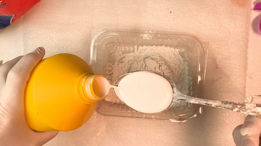Coloco en un recipiente descartable 4 cucharadas soperas colmadas del polvo y para esa cantidad le voy a agregar 1 cucharada de cola vinílica para darle elasticidad y adherencia.