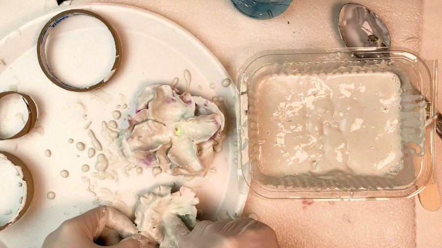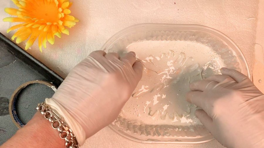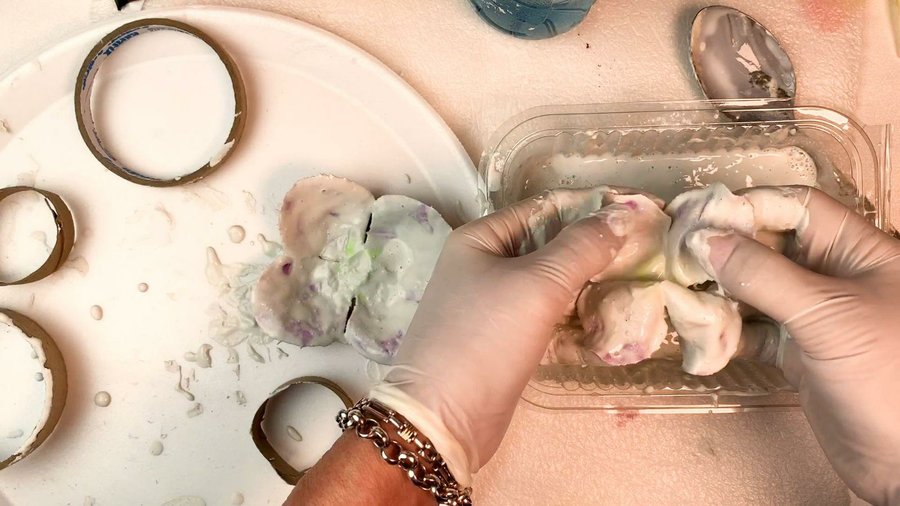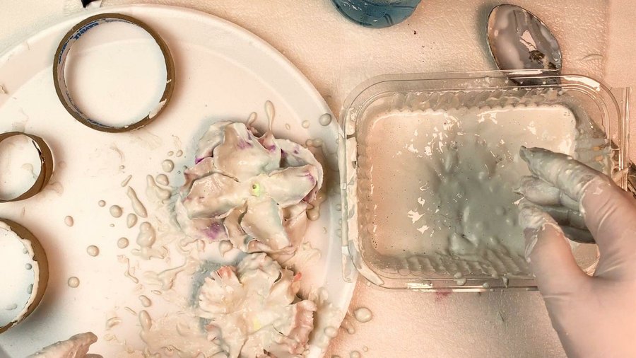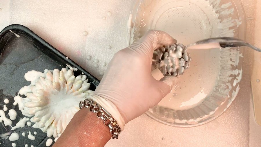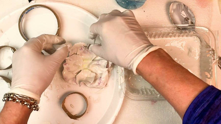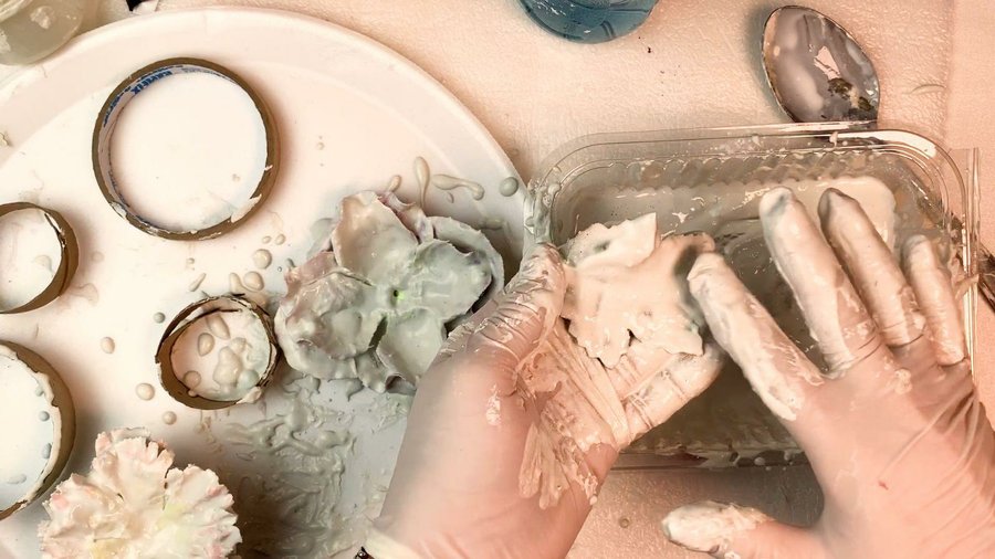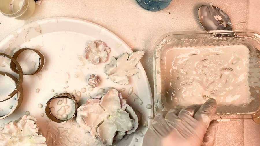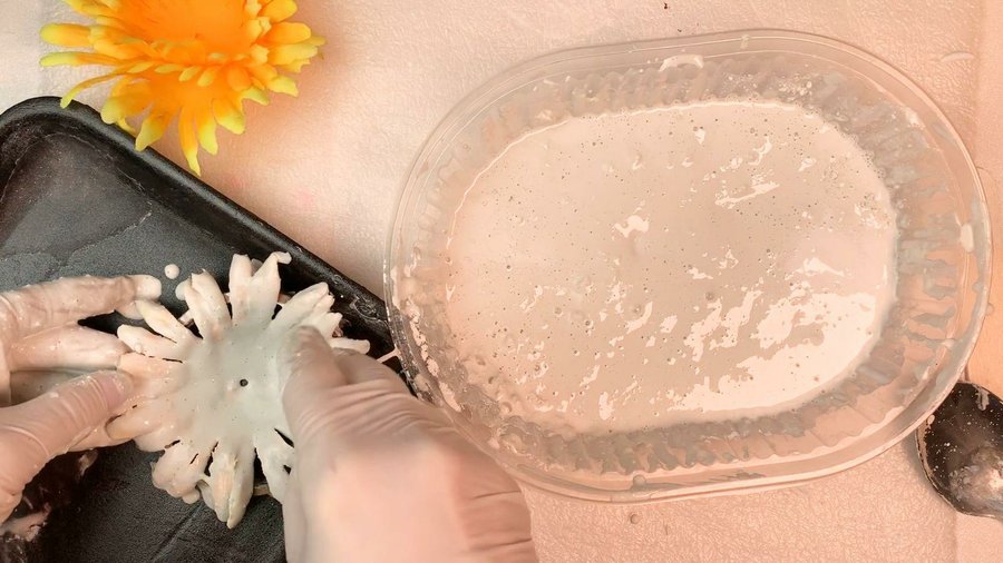 Comienzo a aplicar la pasta, sumerjo en la mezcla primero los pétalos más grandes, de un lado y del otro tratando de que se impregnen bien y luego con cuidado lo ubico sobre alguno de los elementos que tengo en la bandeja para darles forma.