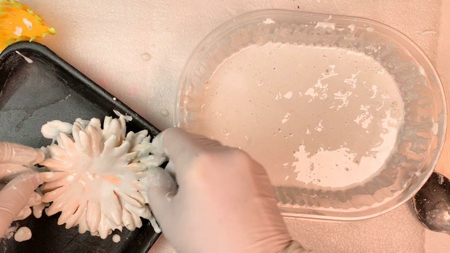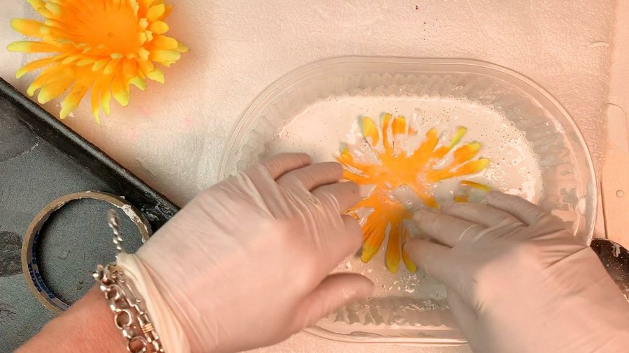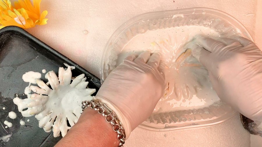 Estos son los pétalos de un girasol, introduzco en la mezcla y los voy pegando por encima tratando de darles forma.