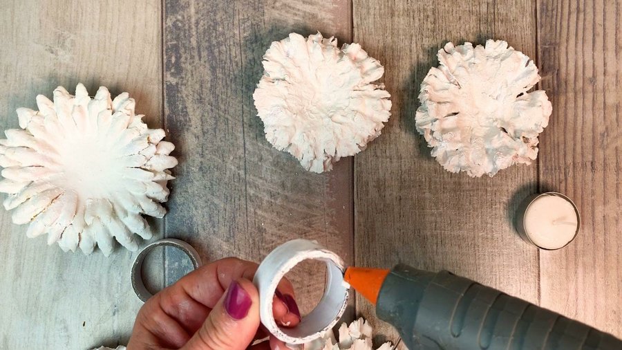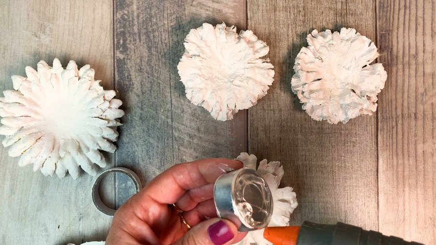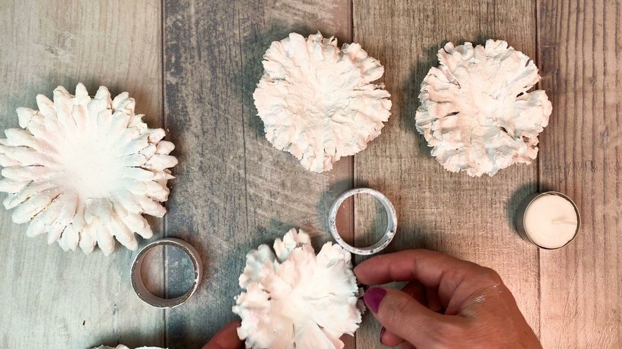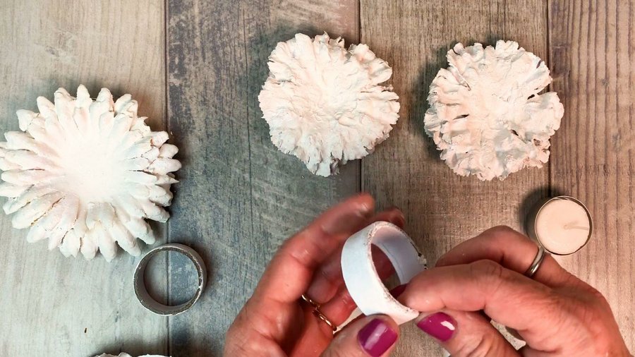 Una vez secas se aclaran más. Algunas de las flores necesito ubicarlas sobre una base para que queden firmes y estables. Para eso puedo usar rollos de cintas pintadas de blanco o tapitas o lo que consiga de ese tamaño y pueda usarse como base.
