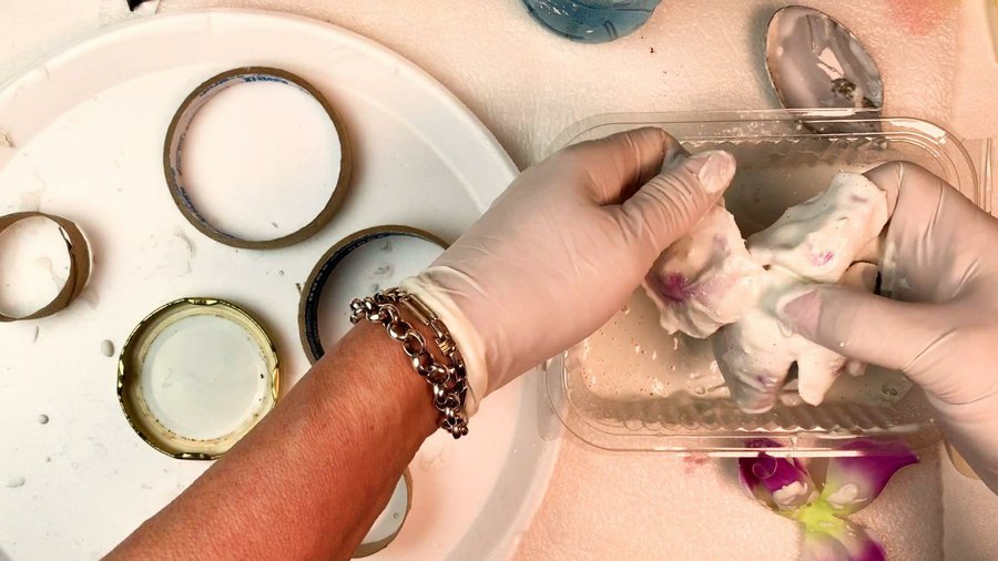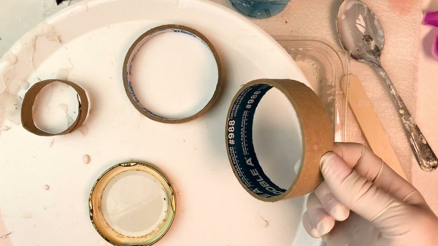 En ésta otra bandeja tengo distintos elementos a donde depositaré los pétalos para que se endurezcan, puedo emplear rollos de cintas, tapas, recortes de tubos de cartón